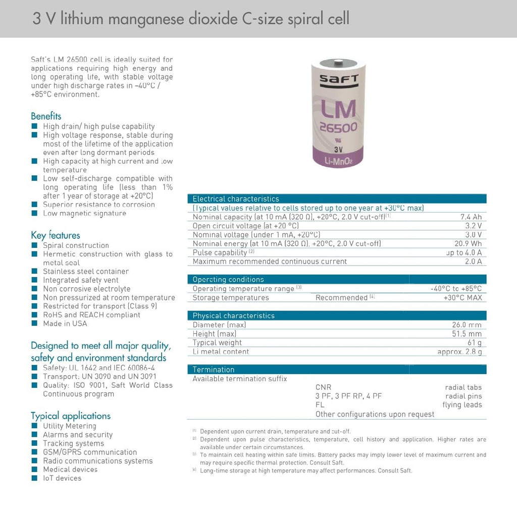 Saft LM 26500 is a Primary Lithium-Manganese Dioxide (Li-MnO2) cylindrical cell and is ideally suited for alarms and security, tracking systems, and medical devices.