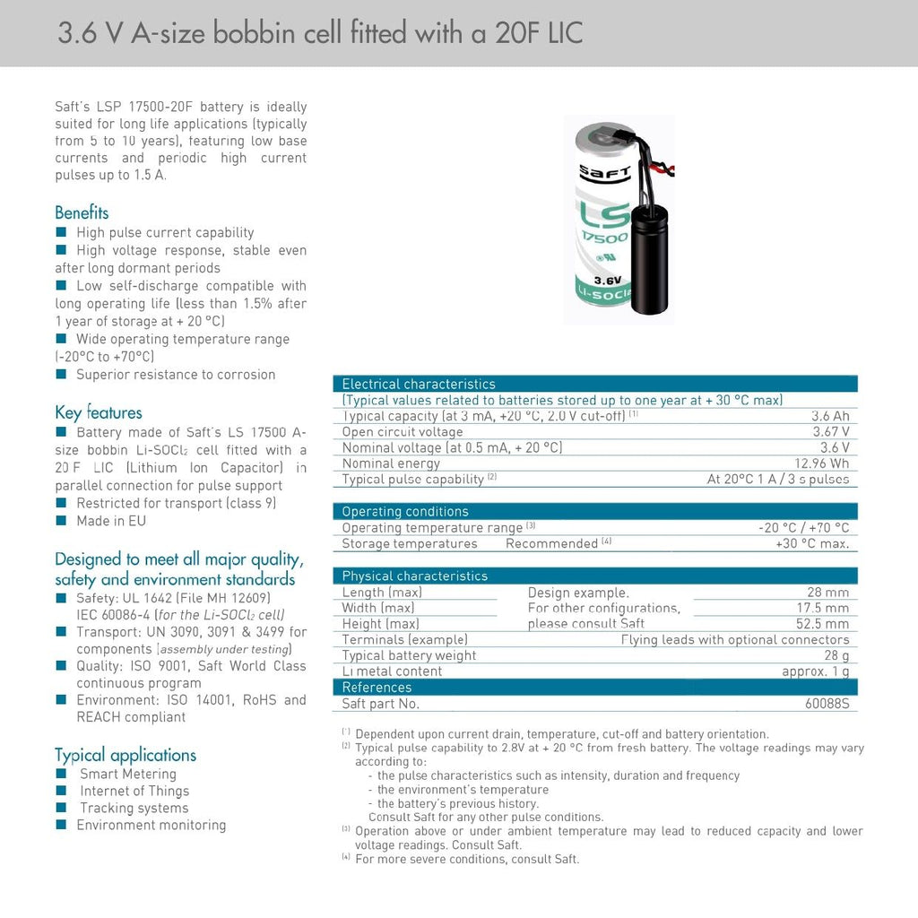The Saft LSP17500‑20F is engineered for long‑term reliability in industrial and IoT systems: