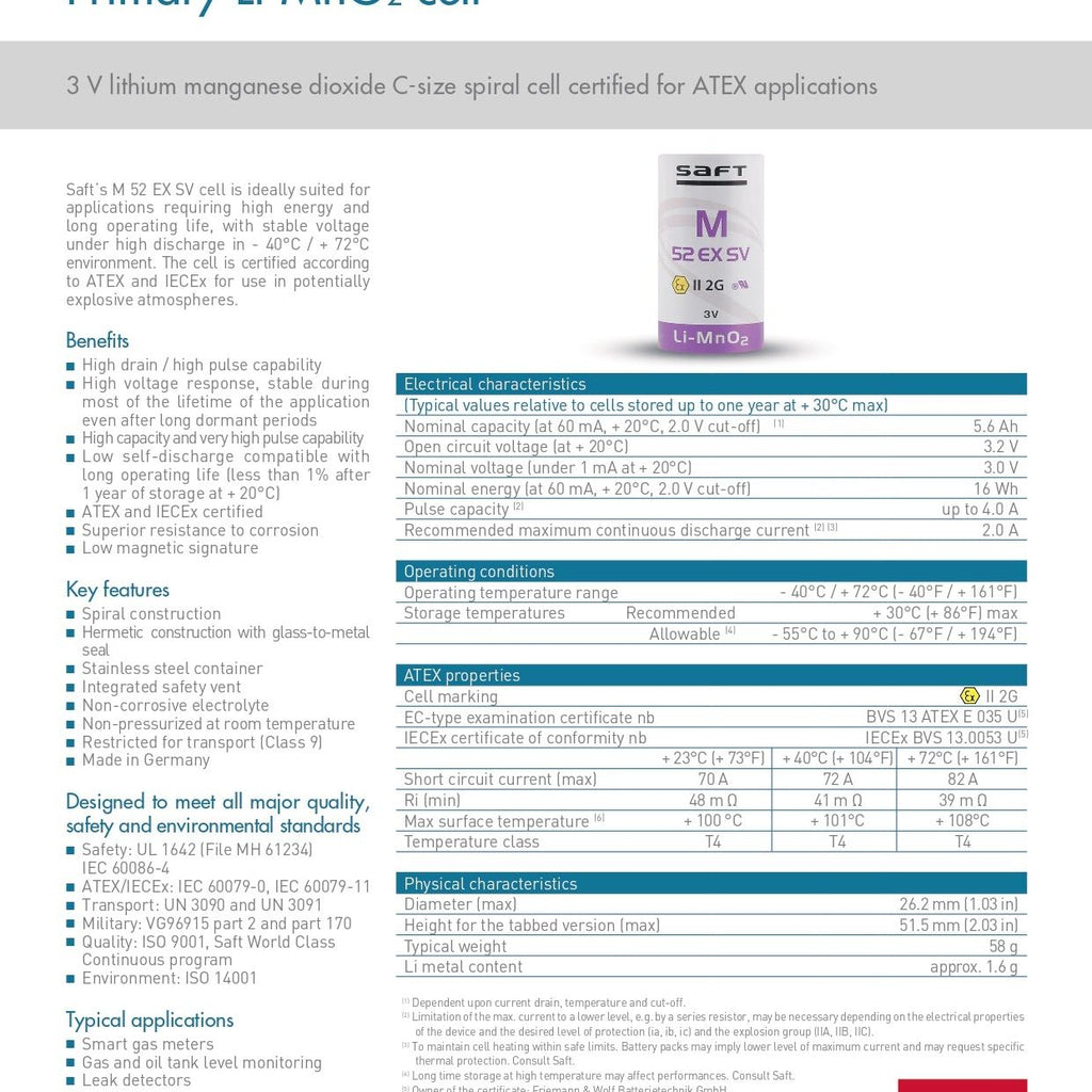 Saft M 52 EX SV is a Primary Lithium-Manganese Dioxide (Li-MnO2) cylindrical cell and is ideally suited for applications requiring high energy and long operating life, with stable voltage under high discharge. It is certified according to ATEX and IECEx for use in potentially explosive atmospheres.