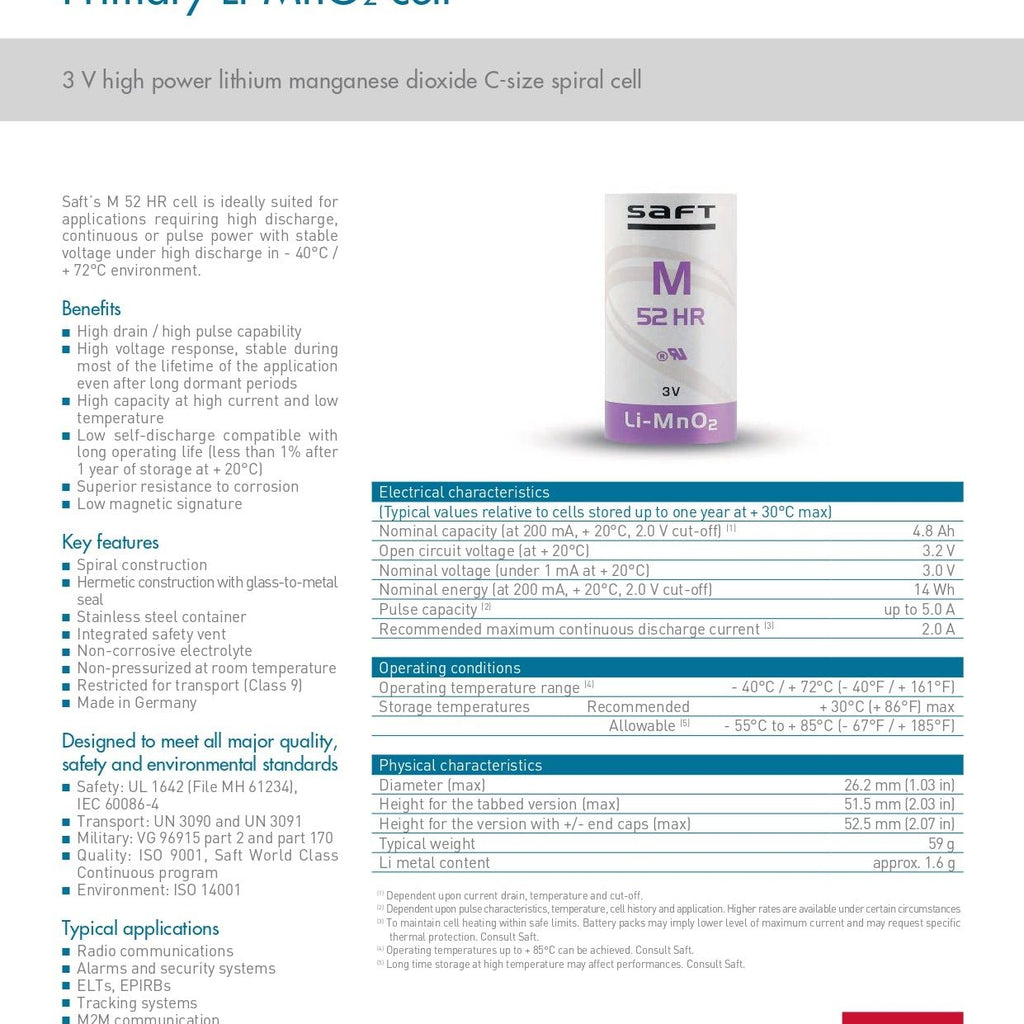 Saft M 52 HR is a Primary Lithium-Manganese Dioxide (Li-MnO2) cylindrical cell and is ideally suited for radio communications, alarm and security systems as well as oil and gas applications.